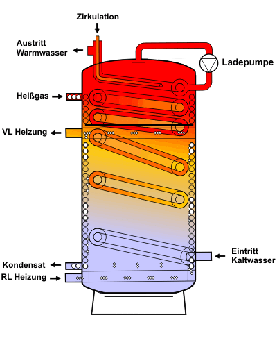 Heißgas in der Warmwasserzone des Speichers abgelagert